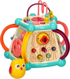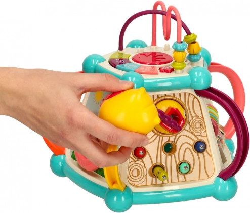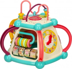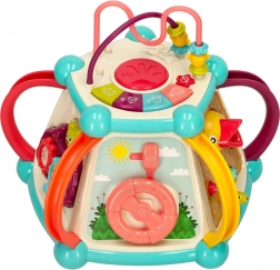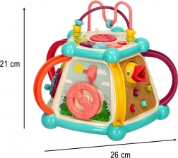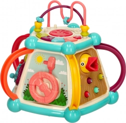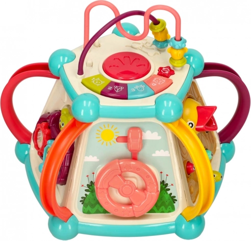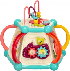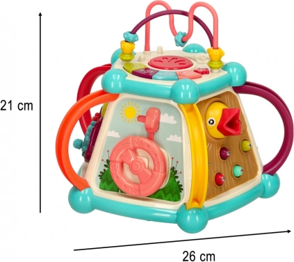 Klavir, volan i rotirajući zupčanici potiču kreativnost i maštu te istovremeno jačaju spretnost prstiju. Svaka strana kocke nudi novu aktivnost.