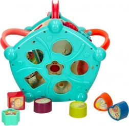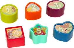 Šest šarenih kocaka i odgovarajući otvori uče djecu prepoznavati oblike, boje i brojeve. Podržava logičko razmišljanje i prostornu orijentaciju.