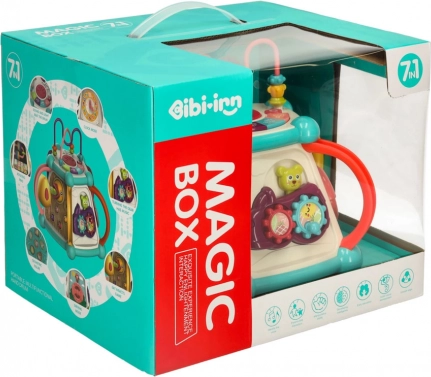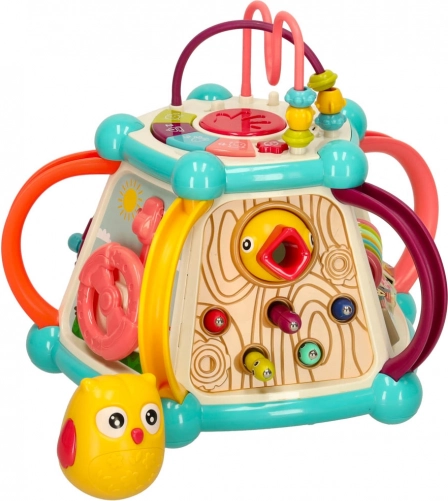 Zahvaljujući robusnoj plastičnoj izradi od ABS-a i PP-a kocka je sigurna i izdržljiva. Zabavni elementi poput zupčanika, klavira, volana, kliznih perlica i rotirajućih blokova sa životinjama održavaju pažnju i razvijaju koordinaciju pokreta. Dio paketa je i sorter oblika sa šest kocaka te originalna igra „nahrani ptičicu“ s crvićima i sovićem za vježbu preciznosti.