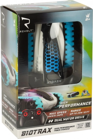 REVOLT BIOTRAX je futuristički trakni RC model koji se ističe izvrsnom prohodnošću i stabilnošću na raznim podlogama. Robusno plastično šasije i široke gumene trake osiguravaju odličnu trakciju, pa ćete uživati u glatkoj vožnji na tepihu, pločicama i travi. LED efekti naglašavaju agresivan dizajn u plavo-bijeloj izvedbi.