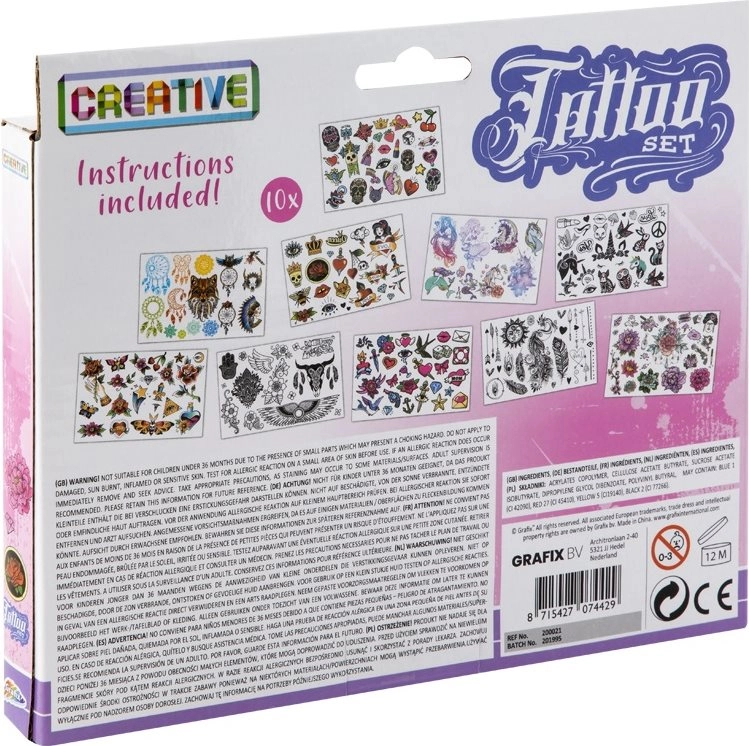 Otkrijte kreativni svijet seta privremenih tetovaža Grafix koji donosi šaroliku paletu motiva za male modne zaljubljenice. Zahvaljujući jednostavnoj primjeni, djeca uz pomoć odraslih mogu imati tetovažu u trenu. Privremene tetovaže idealne su za vikend-zabave, rođendanske partyje i kao mali poklon.