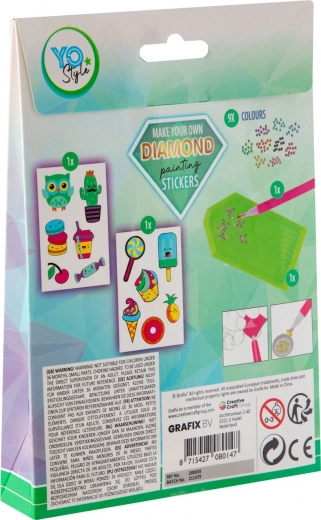 Izradite vlastite blještave naljepnice s motivima slastica uz Grafix set. Dijamantno slikanje je opuštajuće, zabavno i prikladno za djecu i odrasle. U pakiranju je sve potrebno – 12 naljepnica, 9 boja kamenčića, aplikator, vosak i posudica.