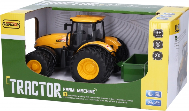 Ovaj traktor dolazi s priborom koji će djecu oduševiti za istraživanje i igru. S dimenzijama 27,5x10,5x12 cm odličan je izbor za igru. Traktor je opremljen dvostrukim kotačima za bolju stabilnost i savladavanje terena. Zahvaljujući zamašnjaku traktor se lako kreće bez potrebe za korištenjem baterija. Svjetlosni i zvučni efekti stvaraju autentičan i uzbudljiv doživljaj.