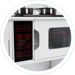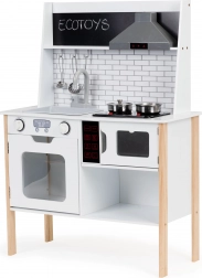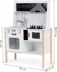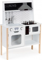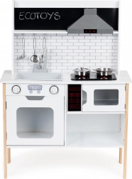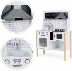 Stilna drvena kuhinjica za male kuhare od 3 godine donosi realističnu zabavu zahvaljujući LED osvijetljenim pločama, zvukovima kuhanja i okretnim “klikajućim” gumbićima. Ne nedostaju pećnica i mikrovalna na otvaranje, pomična slavina ni spremišni ormarići za red. Kvalitetna stabilna konstrukcija marke ECOTOYS razvija maštu i finu motoriku.