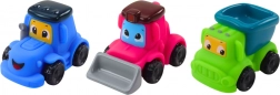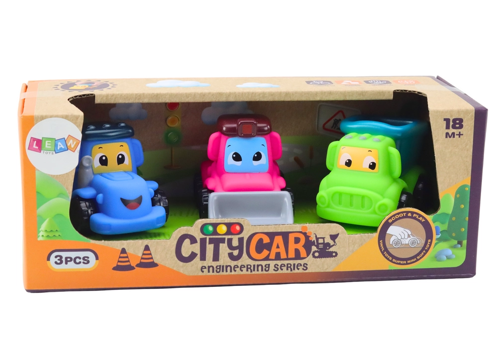 Set od 3 mala poljoprivredna vozila izvrstan je izbor za djecu, pružajući im sate sigurne i kreativne igre. Vozila su izrađena od meke gume i izdržljive plastike te ne sadrže oštre rubove ni sitne dijelove, pa se bez brige mogu dati i najmlađoj djeci. Set sadrži tri simpatična vozila: traktor, buldožer i kipera, svako s prijateljskim nasmiješenim licem koje odmah budi simpatije i potiče na igru.