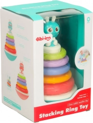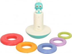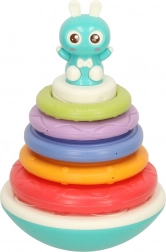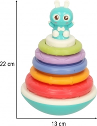 Ovaj šareni toranj razveselit će svako dijete! Sastoji se od njihajuće podloge s malim prijateljem – zečićem – i pet različito velikih prstenova. Zadatak djeteta je nanizati ih jedan po jedan i stvoriti dugini toranj. Nakon svakog stavljanja prstena oglašava se vesela melodija koja potiče dijete na daljnju igru.