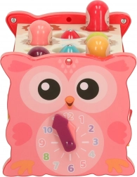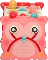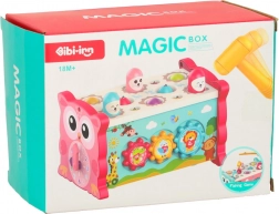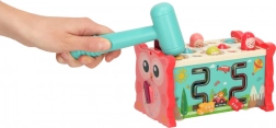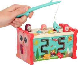 Ova interaktivna ružičasta edukativna igračka spaja više aktivnosti u jednom kompaktnom boxu. Djeca mogu čekićem zabijati “krtice”, loviti šarene ribice i crviće priloženim štapom, okretati šarena kolutića, pomicati autiće u labirintu te upoznavati osnove sata. Živopisne boje i prijateljske ilustracije potiču senzornu stimulaciju i radost u igri.