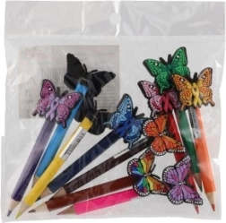 Ovaj komplet sadrži 10 raznobojnih bojica, od kojih svaka ima ukras u obliku leptira na vrhu. Ukrasima se bojicama dodaje razigranost i dekorativni element, zbog čega su idealne za djecu ili kreativno pisanje. Raznobojni leptiri donose dašak mašte u vaše pisanje i crtanje.