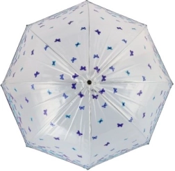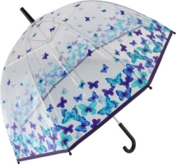 Odaberite ovaj prozirni kišobran s raznobojnim leptirićima, koji donosi kombinaciju elegancije i funkcionalnosti. Ovaj dodatak razvedrit će vaše kišne dane i lako se kombinira s vašom garderobom.