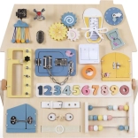 Senzorna ploča Kućica je dizajnirana kako bi djeca mogla vježbati vezanje, spajanje i otvaranje različitih elemenata, čime se pripremaju za svakodnevne zadatke. Brave, trake i pertle pružaju bezbroj mogućnosti vježbanja. Ploča također sadrži brojeve s kojima se mogu vježbati jednostavni matematički zadaci. Uključuje stalak koji osigurava udobnu i ničim ometanu zabavu.