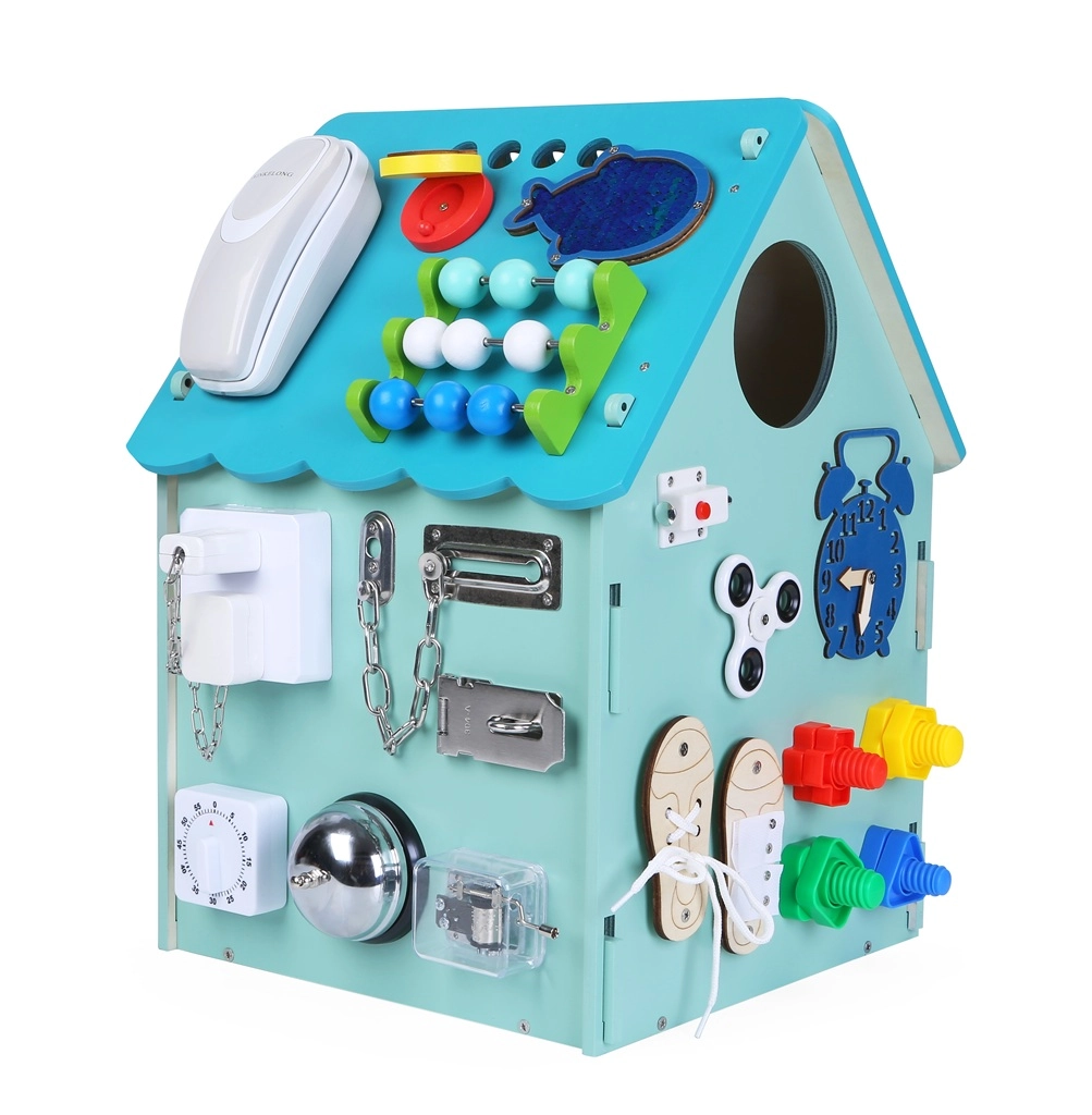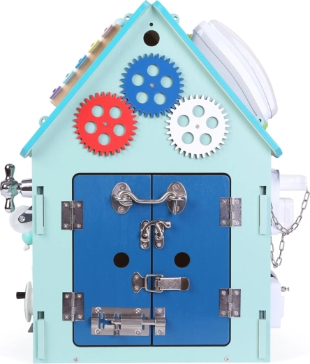 Ova čvrsta drvena kućica prepuna je funkcionalnih elemenata koji djecu potiču na istraživanje. Od zvona preko telefona do raznih lokota i kopči – svaki detalj potiče samostalnost i praktične vještine kroz igru. Obrada u boji može se blago razlikovati prema tirkiznim nijansama.