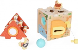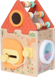 Ova igračka je idealna za razvoj djece jer svaka strana kućice skriva novu avanturu. Bilo da se radi o ubacivanju, pomicanju ili bravama. Kocka sadrži i računaljku koja služi kao krov kućice.