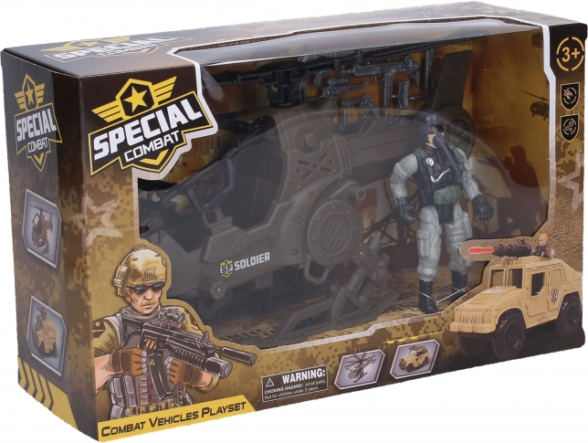 Vojni helikopter s figuricom pilota. Duljina 23 cm, pilot 9,5 cm. Izdržljiva igračka za akcijsku i kreativnu igru. Odličan poklon za male avanturiste.