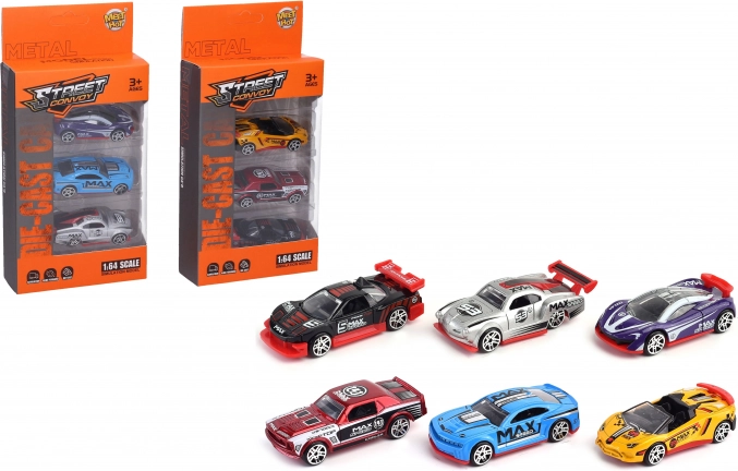 Set od 3 metalna autića duljine 7,5 cm sa slobodnim kotačima. Izdržljiva izrada, kompaktne dimenzije i 2 dizajnerske varijante. Odličan poklon za djecu.