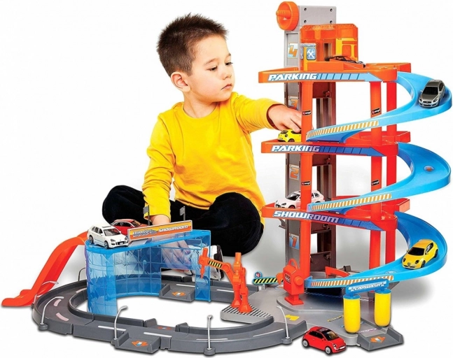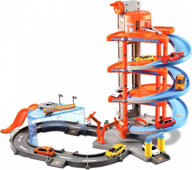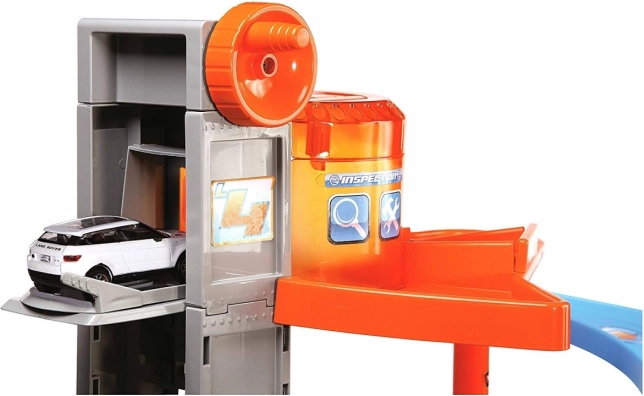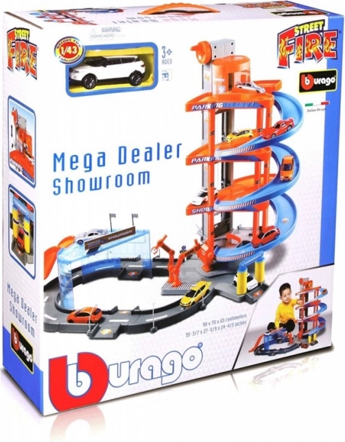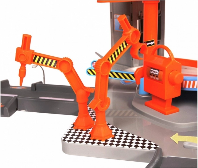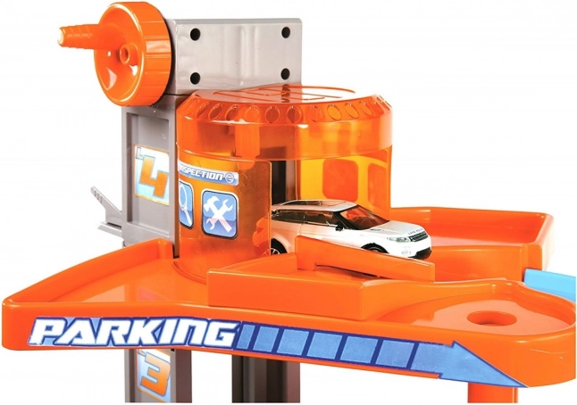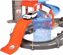 Ova višekatna Bburago garaža s praonicom skriva mnoge funkcionalne elemente! Podigni autić dizalom do najvišeg kata garaže i spusti ga cestom dolje! Zaustavi se u servisu, operi auto u praonici i prođi kroz podizne rampe!