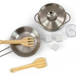 Sadržaj pakiranja: metalna tava, lonac s poklopcem, drvena lopatica i vilica, prozirna čaša i 3 kocke leda. Kuhinjica raste s djetetom zahvaljujući podesivim produžnim dijelovima nogu, pa će pružati godine radosne igre.