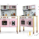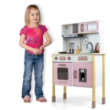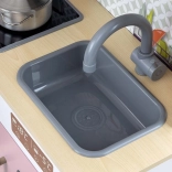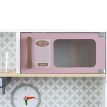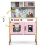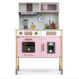 Sastavni dio je pećnica s prozirnim prozorčićem, mikrovalna pećnica, hladnjak s realističnim ledomatom i jednokomorni sudoper. Na panelu se nalazi napa sa svjetlom i zvukom, klizne kukice za vješanje pribora i sat s pomičnim kazaljkama za učenje vremena. Ilustracije kuhinjskih elemenata na zidu potiču maštu i tematsku igru.