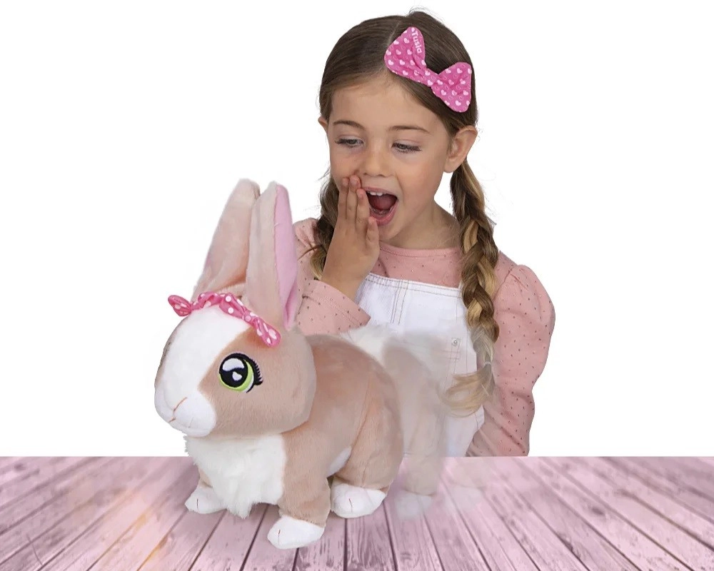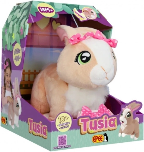Preslatki interaktivni zeko Tusia mekana je plišana igračka za djecu od 18 mjeseci, koja se pri maženju skače, miče uškama i ispušta prijateljske zvukove. Dio paketa je i ružičasta mašnica koju možete koristiti kao gumicu za kosu – idealan poklon za male ljubitelje životinja.