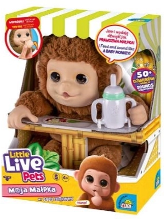Novo egzotično, vrlo realistično ljubimče iz kolekcije Little Live Pets. Zaigrana majmunica Mango, koja obožava ludirati se. Više od 50 zvukova i reakcija zahvaljujući kojima će vaša igra s njom biti izvanredno posebna. Izgleda i ponaša se kao pravi majmun, a njezina omiljena igra je uhvatiti se i objesiti glavom prema dolje! Mango dodatno prepoznaje u kojem se položaju nalazi! Njezino se lice vrlo realistično pomiče dok govori, jede ili sisa palac. Baci je uvis i veselo će se smijati, ali pozor, i majmunici je jednom dosta. Ako je predugo bacate uvis, počet će joj se vrtjeti u glavi. Tada je možete poškakljati po trbuščiću i zarazit će vas svojim radosnim smijehom.