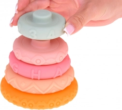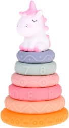Ova originalna igračka, Jednorog s prstenovima u boji, idealna je za razvoj senzornog doživljaja djece. Prstenovi su izrađeni od mekane, sigurne gume, svaki s jedinstvenom teksturom.