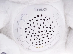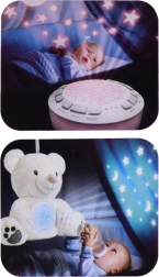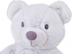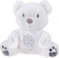 Ovaj mekani bijeli medo spaja igračku i noćno svjetlo u jednom. Zahvaljujući 6 nježnim uspavankama i 5 autentičnih zvukova prirode pomaže umiriti dijete i stvoriti osjećaj sigurnosti. Šareni projektor zvijezda i mjeseca stvara na zidovima i stropu umirujuću atmosferu koja rastjeruje tamu i potiče miran san.
