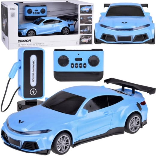 Plavi RC trkaći auto s realističnim detaljima i punionicom kao kod pravih električnih vozila razveselit će svakog malog ljubitelja brzine. Nudi vožnju naprijed/natrag, skretanje desno/lijevo, automatsko parkiranje, svjetlosne efekte u 5 režima i zvuk trube i glazbe. U pakiranju su punjiva baterija za auto i stanicu te upravljač s intuitivnim upravljanjem.