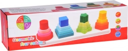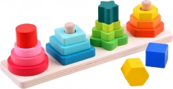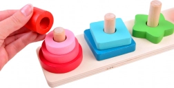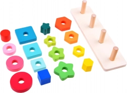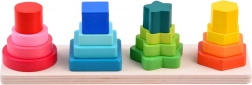Četiri stupića s različitim oblicima potiču djecu na prepoznavanje i razvrstavanje boja i oblika, čime razvijaju vizualnu percepciju i logiku.