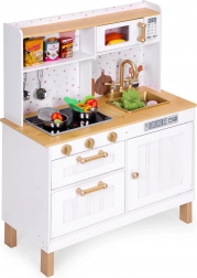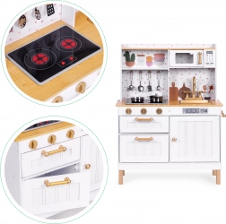 Drvena dječja kuhinja ECOTOYS je idealan izbor za male šefove. Donosi radost i zabavu pri oponašanju stvarnih kuhinjskih aktivnosti i razvija manuelnu spretnost i maštovitost. Kuhinja je izrađena od kvalitetnih materijala i uključuje 7 metalnih kuhinjskih dodataka.