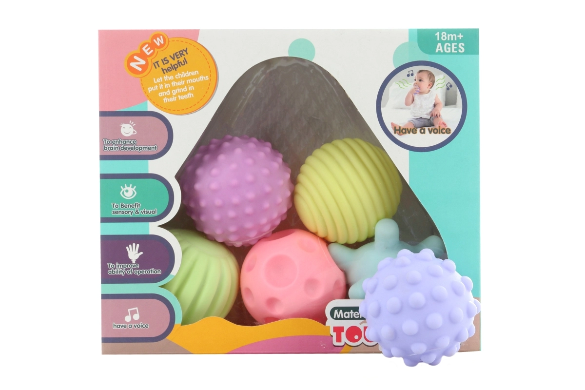 Set senzoričkih loptica za najmlađu djecu. Loptice su različitih oblika i boja. Loptice pište. Pakirano u kutiji. Dimenzije pakiranja cca 21x18x7 cm. Veličina loptice cca 5–6 cm. Dob 18m+