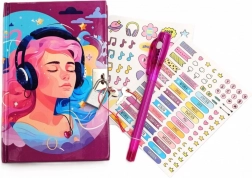 Magijski svjetlosni glazbeni dnevnik sadrži 40 liniranih stranica. Ima tvrde korice ukrašene LED svjetlima i zatvaranje s lokotom. U kompletu su 2 lista naljepnica i olovka s dva vrha. Jedan sadrži običnu tintu, a drugi nevidljivu tintu koja je vidljiva samo uz pomoć posebne "lampice" na olovci.