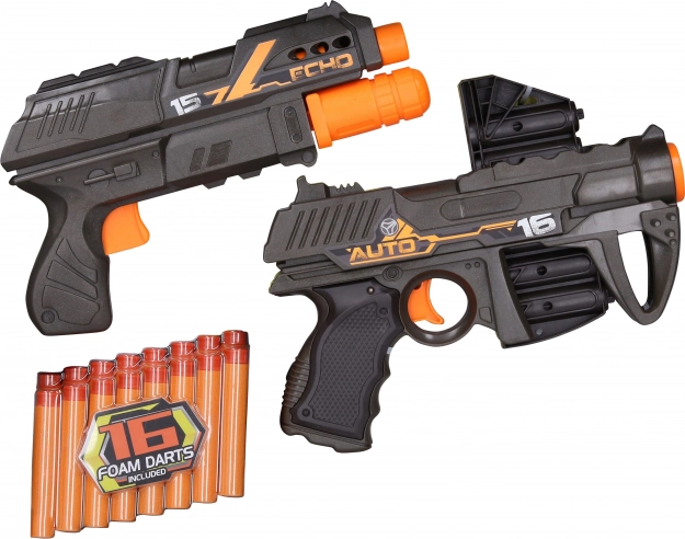 Zabavan set dvaju pjenastih blastera za akcijske igre u zatvorenom i na otvorenom. Sadrži pištolj Auto Scout sa spremnikom za 6 metaka i pištolj Echo‑1 s pumpnim punjenjem. U pakiranju je 16 pjenastih metaka, domet do 15,2 m i jednostavno upravljanje okidačem za sigurnu i brzu zabavu.
