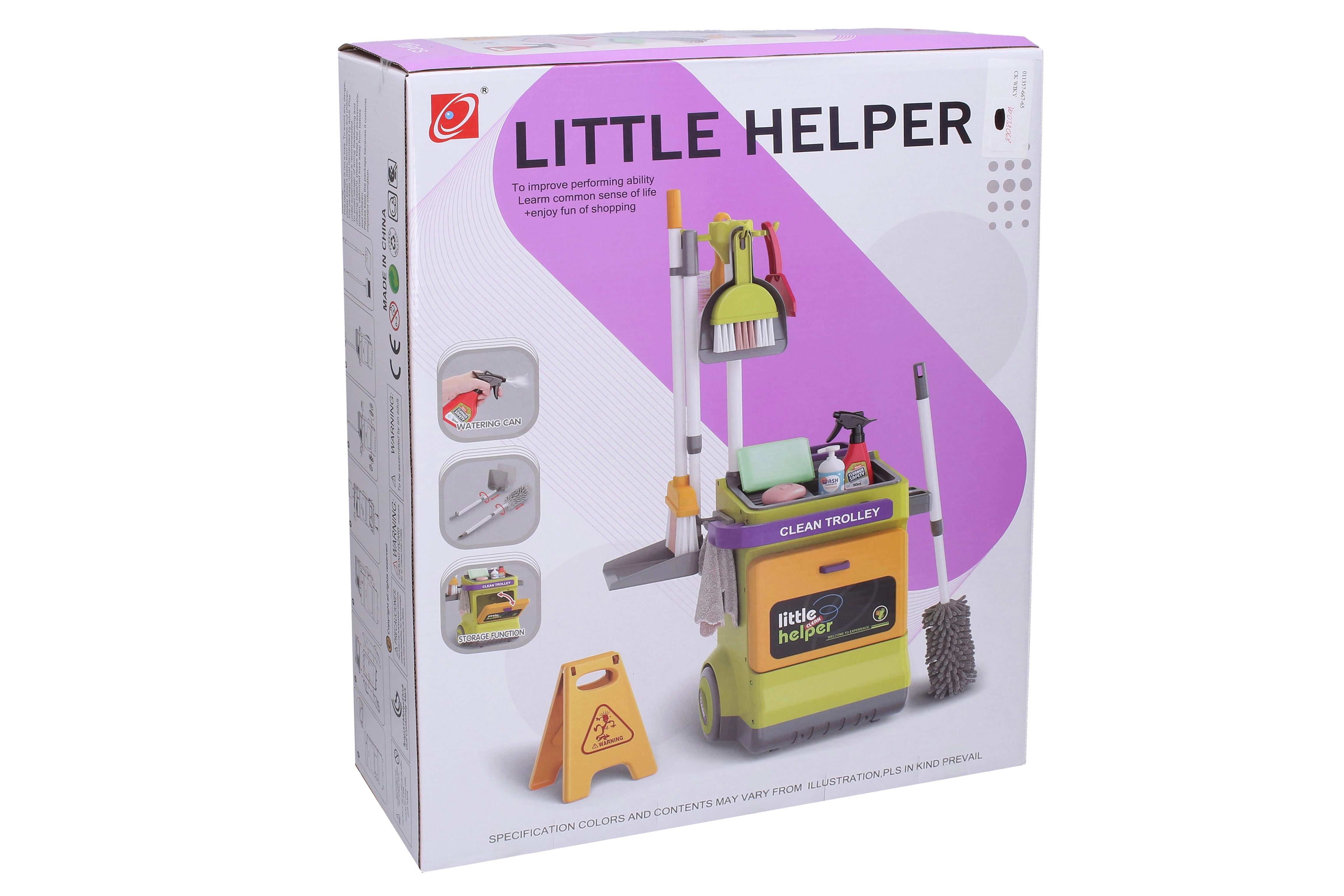 Kompletan set za čišćenje s kolicima za male pomoćnike u kućanstvu sadrži sve što je potrebno za igru čišćenja. Zahvaljujući bogatoj opremi i realističnim dodacima, djeca će uživati u satima zabave te istovremeno razvijati motoriku i osjećaj odgovornosti. U kompletu su metle, ručna metlica, lopatice, praška, brisač za prozore i “sredstva za čišćenje” za još autentičniji doživljaj.