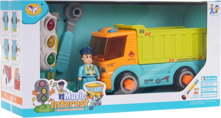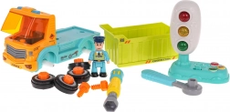 Dio seta je interaktivni semafor sa svjetlosnim (crvena, žuta, zelena) i zvučnim efektima (melodije, truba, paljenje motora, alarmi), koji kroz igru uči prometnim situacijama. Dva odvijača pomažu djeci rastaviti auto na dijelove i ponovno ga sastaviti – tako razvijaju finu motoriku, strpljenje i tehničko razmišljanje.
