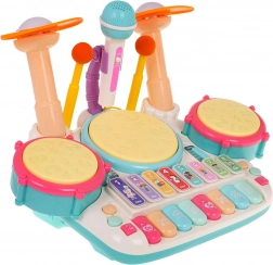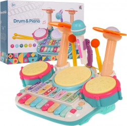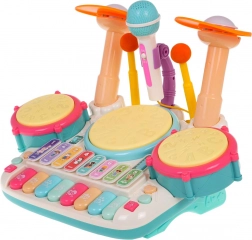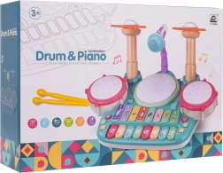 . | Interaktivni glazbeni set, klavir s bubnjevima za djecu od 3 godine. Glazbena igračka izrađena je od najkvalitetnije plastike u živim bojama i potiče dijete na igru i učenje sviranja glazbenih instrumenata. Igračka kombinira udaraljke i klavir te je opremljena mikrofonom i zvučnim sustavom. Tipke reproduciraju zvuk klavira, trube, gitare, životinja i nazive brojeva. Tri bubnja i činela svijetle pri svakom udarcu palicama. Tu je i način učenja, pri kojem se na bubnjevima pale svjetla (jedno svjetlo, dvostruko svjetlo, trostruko svjetlo – različitim brzinama) i uče dijete lupkati ritmove. Glazbena igračka ima kontrolu glasnoće i ulaz za mikrofon koji je dio seta. Igračka radi na 4 AA 1,5 V baterije (nisu uključene). . Funkcije seta: . - namijenjeno djeci od 3 godine, .- izrađeno od najkvalitetnije plastike, .- bez oštrih rubova, .- žive boje privlače dječje oči, .- osvijetljeni bubnjevi i činela, .- mikrofon sa ozvučenjem, .- načini sviranja i učenja, .- zvukovi klavira, trube, gitare, životinja, brojeva, .- kontrola glasnoće, .- ulaz za mikrofon, . |
