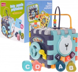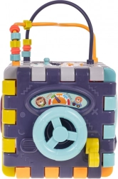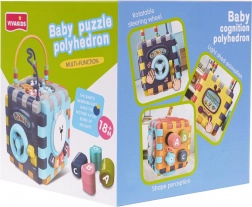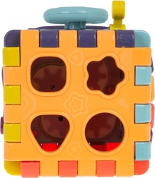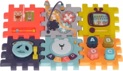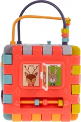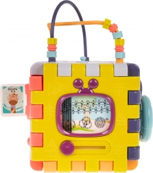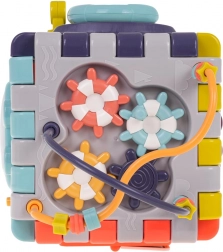 Gornji dio donosi zupčanike i perlice za vježbanje koordinacije oko–ruka. Sorter oblika s 4 obojene kocke potiče prepoznavanje oblika i logičko razmišljanje. Kocka je izrađena od izdržljive plastike u živim bojama i svojim dizajnom motivira na istraživanje i samostalnu igru.