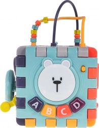 Ova pametna dječja kocka lako se rasklapa “na ravno”, pa se dijete može zabavljati s pojedinim pločama zasebno. Interaktivna strana s medićem privlači svjetlećom glavom i tipkama A, B, C, D koje reproduciraju melodije i poučavaju slovima na engleskom. Tu su i volan s “ručicom mjenjača”, klizači, rotirajući elementi i mala okretna knjižica.