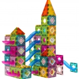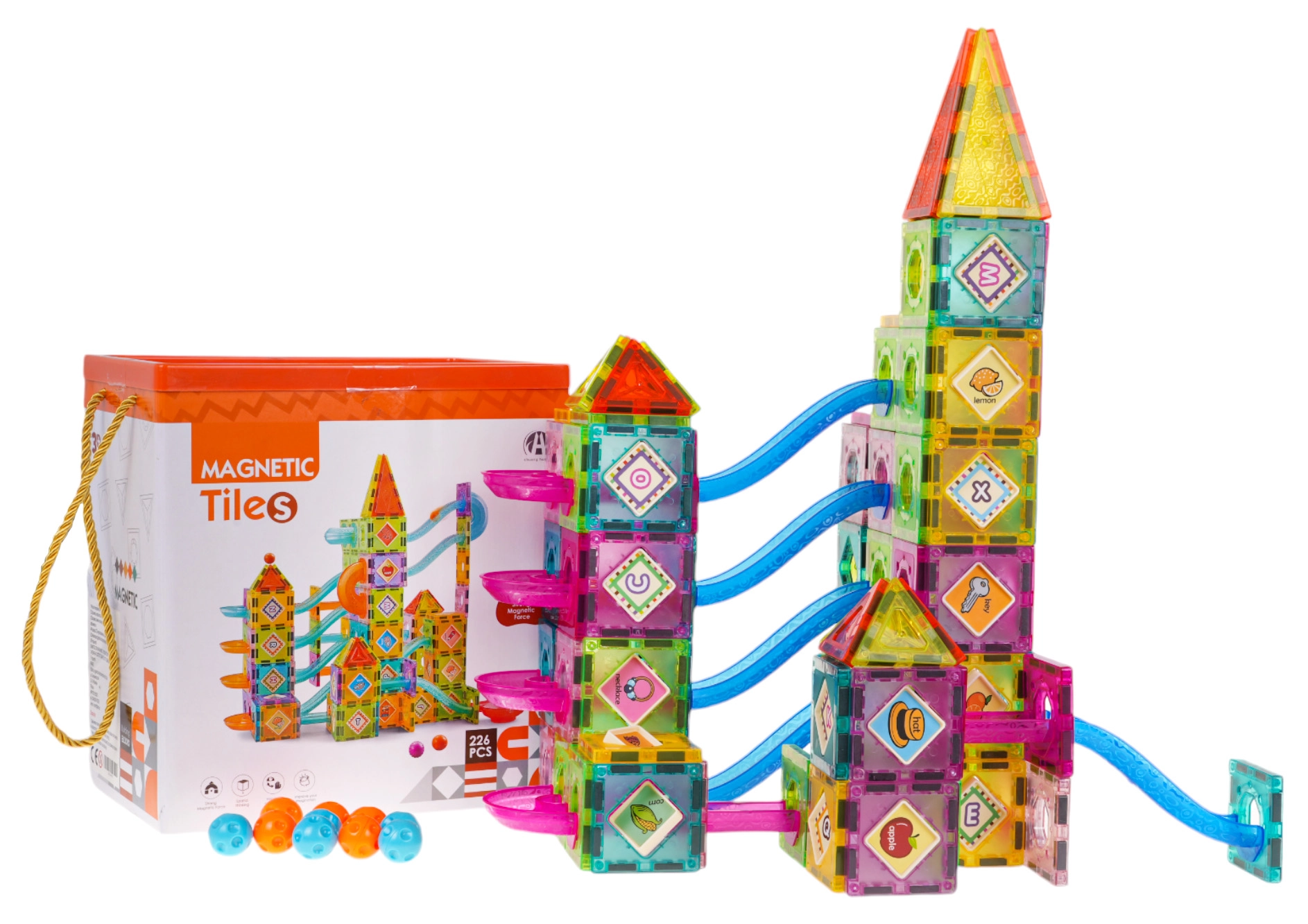 Ovaj opsežan set kombinira magnetične pločice i elemente za kuglične staze, pa djeca od 3 godine mogu graditi tornjeve, dvorce i originalne rute za šarene kuglice. Dijelovi su izrađeni od kvalitetne, glatke plastike u živim bojama, magnetizirani rubovi lako i čvrsto se spajaju, a konstrukcije dobro drže i kod viših građevina.