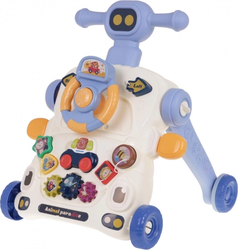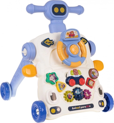 Ova multifunkcionalna guralica razveselit će roditelje i djecu: služi kao oslonac pri prvim koracima, a ujedno kao stolić s aktivnostima za razigran razvoj. Panel nudi volan sa zviždaljkom, zupčanike, sorter oblika i mini koš za ubacivanje loptice – sve osmišljeno tako da jača koordinaciju, koncentraciju i motoričke vještine.