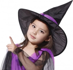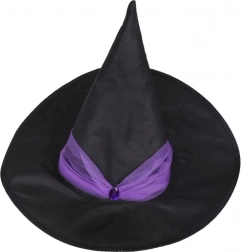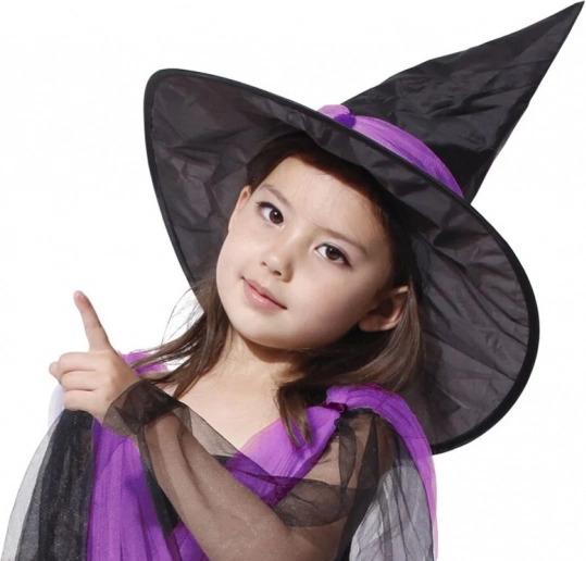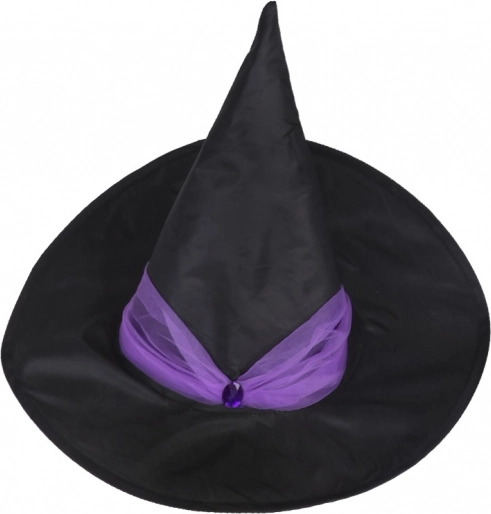 Klasični crni šešir s ljubičastim ukrasima savršeno upotpunjuje kostim i naglašava vještičju atmosferu.