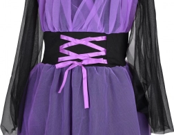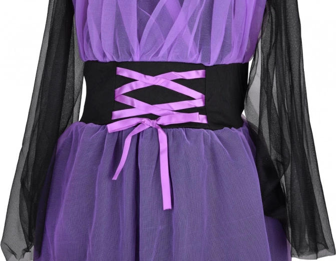 Pretvorite svoju malu ljepoticu u tajanstvenu vješticu. Haljina u kombinaciji crne i ljubičaste boje sa zračnim slojem tila i dekorativnim vezanjem na korzetu stvara upečatljiv, a i dalje udoban kostim. Lagani tekstil ugodan je za nošenje i ne ograničava kretanje, pa je odličan za cjelovečernju zabavu.