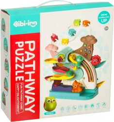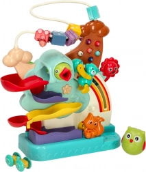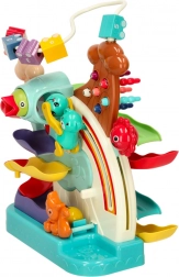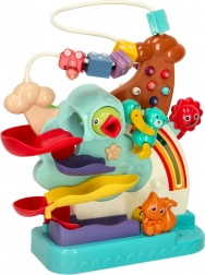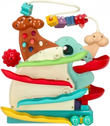 Šarene kuglice i mali autić jure po dvjema razinama staza, koje potiču koncentraciju i koordinaciju. Djecu zabavlja promatrati pad kuglica i isprobavati nove kombinacije.