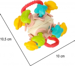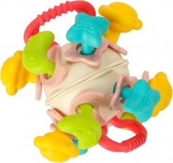Silikonski dijelovi služe kao sigurna grizalica koja olakšava osjetljivim desnima. Kuglica motivira djecu na hvatanje, okretanje i premještanje iz ruke u ruku, čime doprinosi razvoju fine motorike i koordinacije oko–ruka.