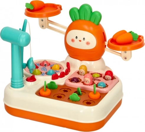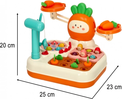 Ovaj interaktivni set pretvara učenje u igru. Djeca će isprobati ravnotežu i uspoređivanje težine na vagalici, uvježbati reflekse i preciznost pri lovu ribica, ojačati snagu hvata i brze reakcije u igri krtice s plastičnim čekićem te razvijati strpljenje i logičko razmišljanje pri sađenju i skupljanju mrkvica.