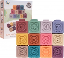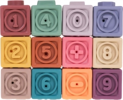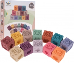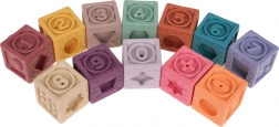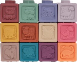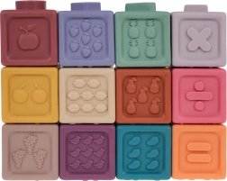 Set sadrži 12 raznobojnih silikonskih kocki koje potiču vizualnu stimulaciju i kreativnost djece.