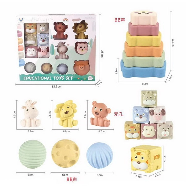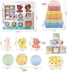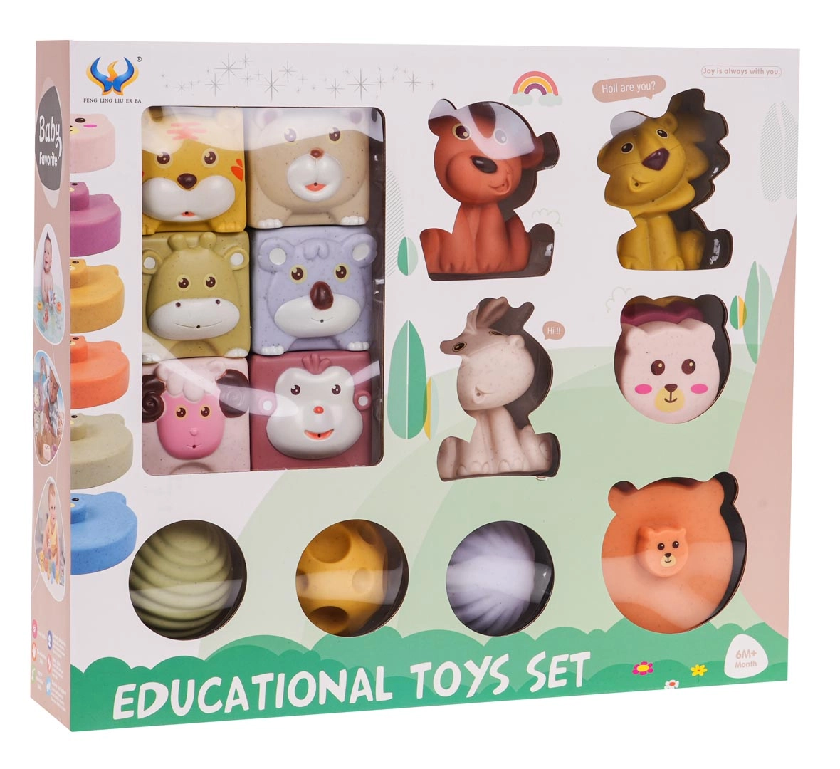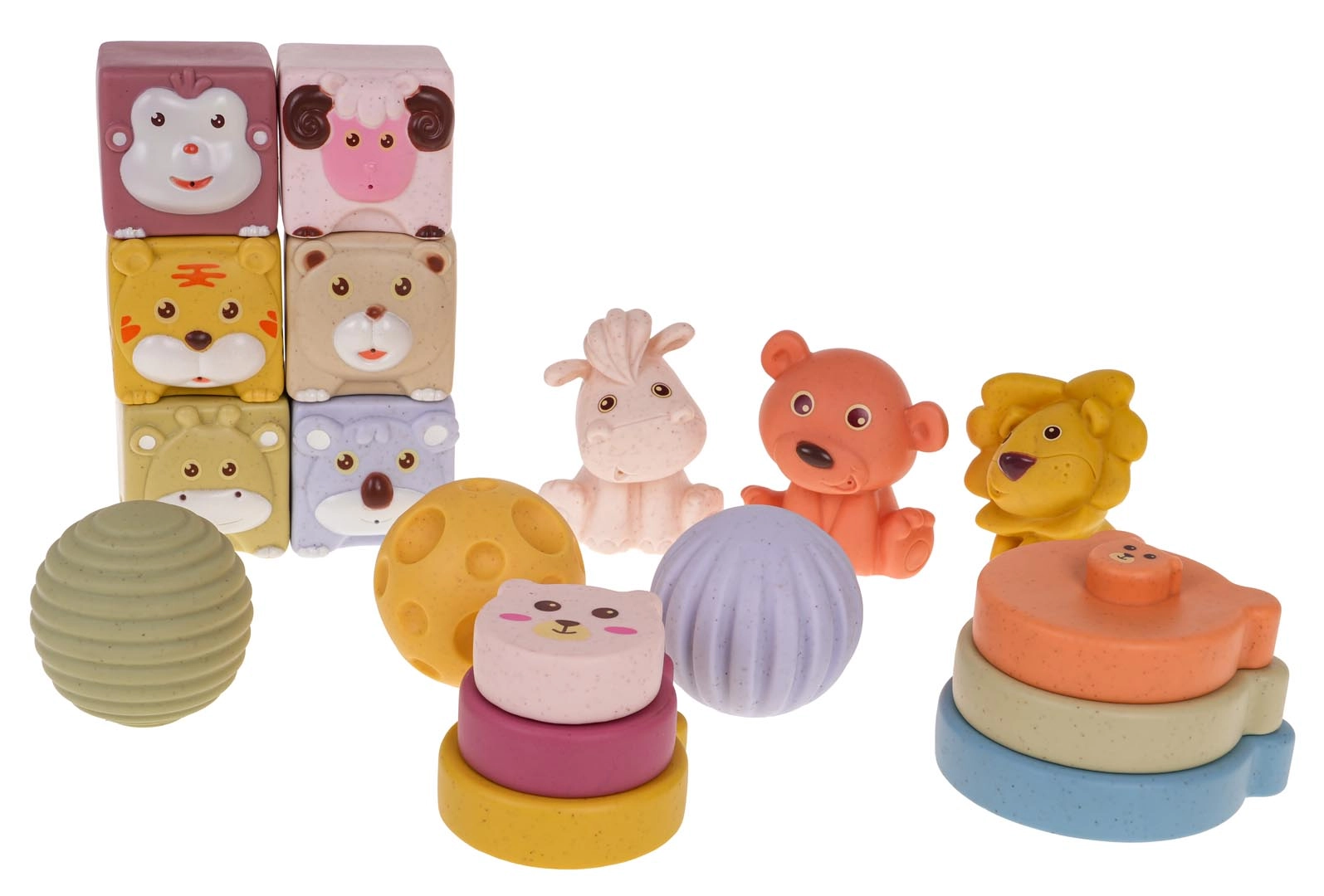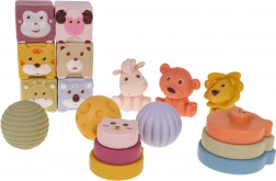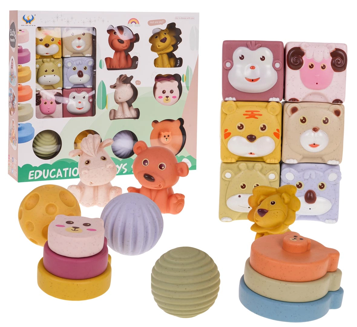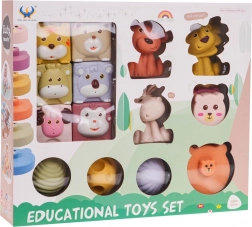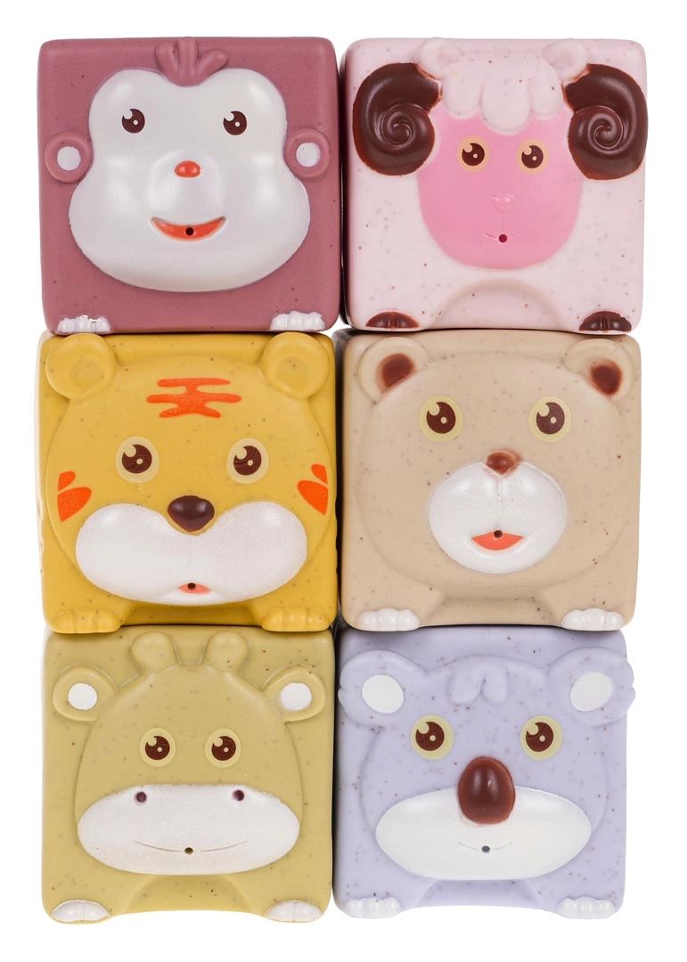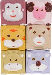 - 6 kocaka sa životinjama: majmun, ovca, tigar, medvjed, jelen, koala; svaka s različitom teksturom i bojom.