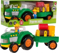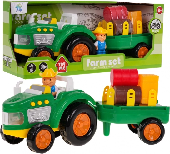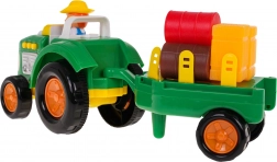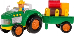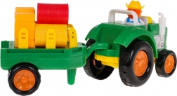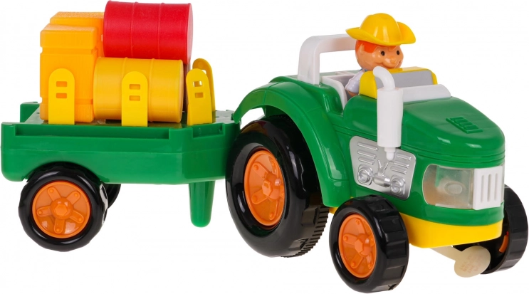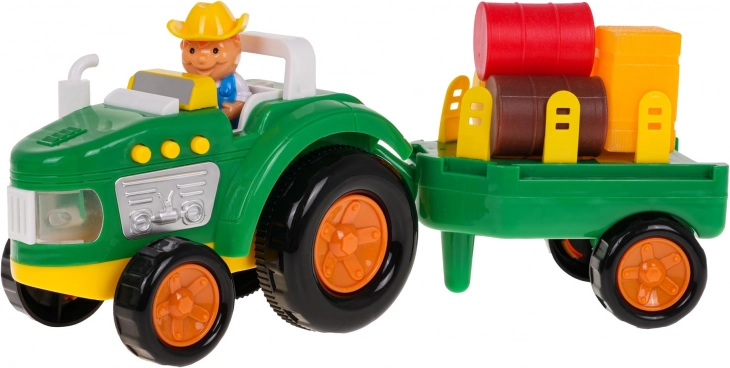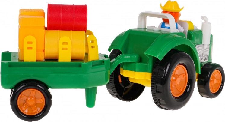 Probudi dječju maštu s šarenim, interaktivnim traktorom s odvojivom prikolicom. Ovaj traktor opremljen je zvučnim efektima, kao što su zvukovi pokretanja, rada stroja i trube, kao i svjetlosnim efektima u obliku bljeskajućih prednjih svjetala. Set uključuje figuricu farmera te razne bale i kocke sijena za još bolju farmersku atmosferu.