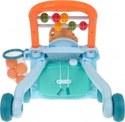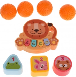 Gornji dio nadopunjuju sorter oblika (3 oblika), brojilo sa 6 perlica i odvojivi klavirčić sa zvukovima životinja i melodijama. Sa strane je praktična košarica za loptice, a u pakiranju ćete pronaći čak 4 loptice za dodatnu igru i vježbu bacanja.
