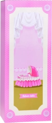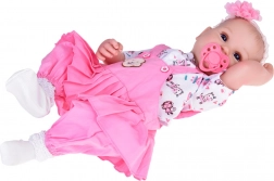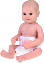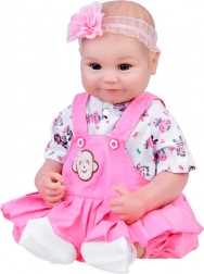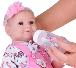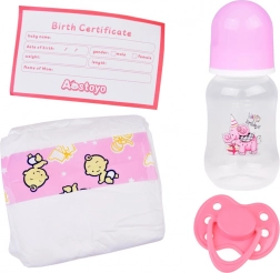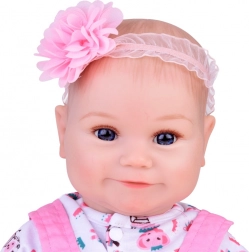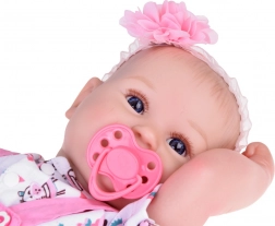 Realistična bebina lutka duljine 50 cm oduševit će svako dijete svojim mekim tjelešcem, pokretnim udovima i prekrasnim osmijehom. U kompletu je bogat set dodataka za igru brige – bočica, pelena, magnetska duda varalica, rodni list i slatka roza odjeća s trakicom za kosu. Lutka djeluje kao pravo beba i potiče maštu te empatijske vještine djece.