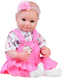 Ova slatka bebina lutka izrađena je od kvalitetnih materijala s naglaskom na detalje – ima mekano tjelešce, gumene pokretne ručice i nožice te realistične crte lica s plavim očima i dugim trepavicama. Glava je s oslikanom kosicom, pa je idealna i za najmlađe mališane koji se vole brinuti. Odjeća u ružičastim tonovima s motivima životinja i cvjetnom trakicom daje lutki nježan i umiljat izgled.