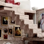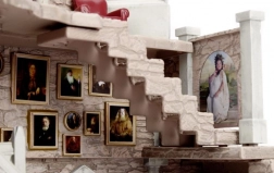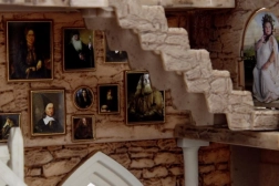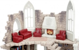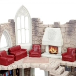 Mali model sobe sa starim kamenom i gotičkim lukovima prozora. Crvena sjedala oko kamina ističu gotički stil.